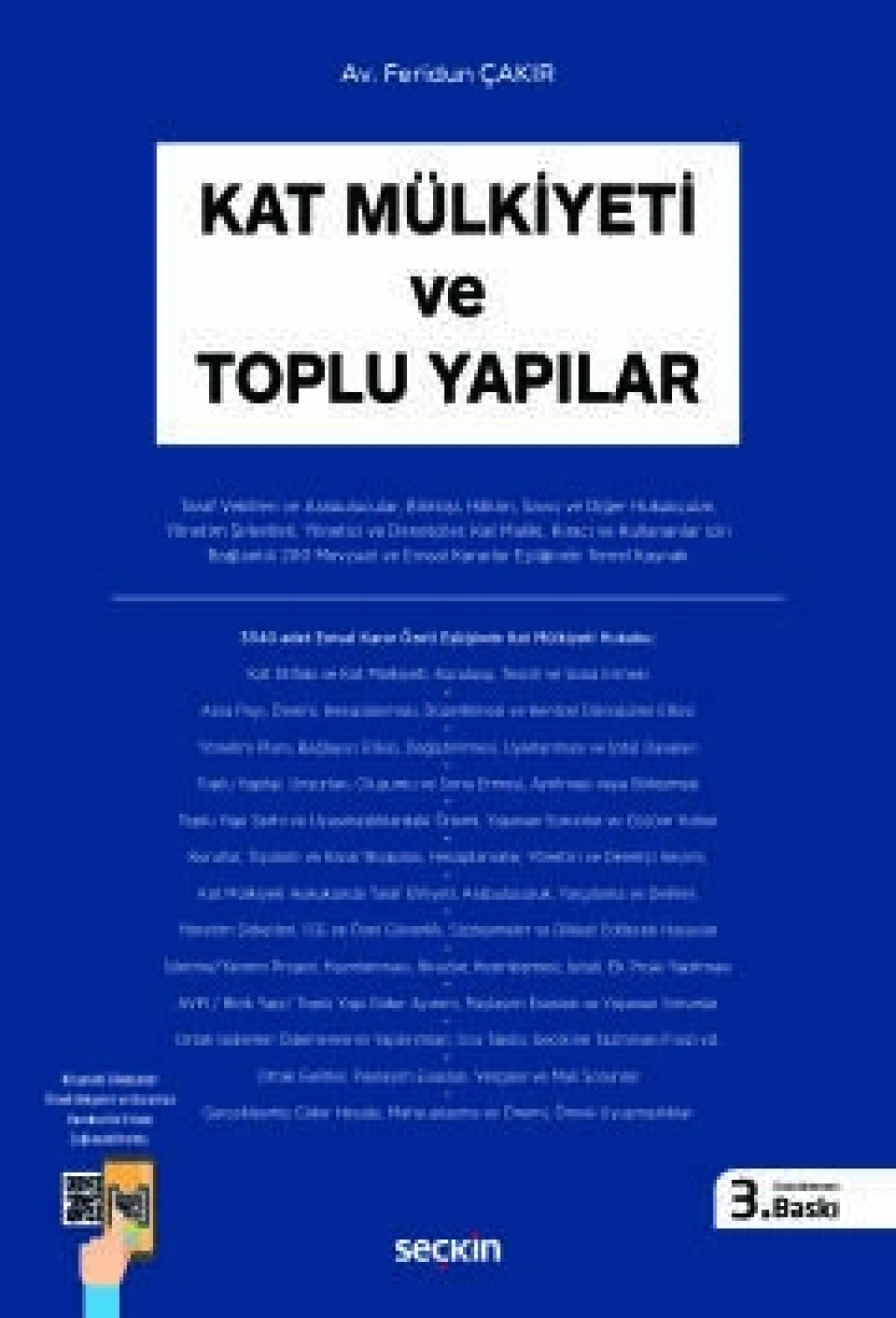 Kitap 17 bölümden oluşmaktadır. 1.bölümde; kat irtifakı ve kat mülkiyeti, kuruluşu ve sona ermesi, temel kavramlar, arsa payı, önemi, hesaplanması, arsa paylarının düzeltmesi ve davalar, 2.bölümde; toplu yapının kurucu unsurları ve sona ermesi, toplu yapı şerhi ve uyuşmazlıklardaki önemi, 3.bölümde; yönetim planı, kapsamı, önemi, bağlayıcılığı, değiştirilmesi, uyarlanması, iptali ve hâkim müdahalesi ile yönetim sözleşmesi, 4.bölümde; toplu yapılarda kurullar, toplantı zamanı, gündem, çağrı, tebligat, oy hesabı, toplantı ve karar nisapları, hesaplamalar, kararların yazılması, itiraz şerhi, iptal davaları, 5.bölümde; toplu yapılarda yöntem, yönetici ataması, atama şartları, atama yapacak kurullar, hâkim müdahalesi, 6.bölümde; yöneticinin görevleri, yetkileri, sorumluluğu, hakları ve borçları, hesap vermesi, 7.bölümde; kat mülkiyetinde taraf ehliyeti, 8.bölümde; toplu yapılarda denetim, denetçi atayacak kurullar, denetçinin görev, yetki ve sorumlulukları, denetimin içeriği, denetim raporu ve sonuçları, 9.bölümde; yönetim ve denetim görevinin sona ermesi, hukuki ve cezai sonuçları, 10.bölümde; toplu yapılarda yönetim, hizmet ve danışmanlık şirketleri, sözleşme örnekleri, 11.bölümde; özel güvenlik ve İSG mevzuatı, işçi ve işveren uyuşmazlıklarından kaynaklanan davalar, 12.bölümde; kat mülkiyetinde hak ve yükümler, güçlendirme ve kentsel dönüşüm, 13.bölümde; ortak giderler, kat maliki, kiracı ve devamlı kullananların sorumluluğu, kapsamı, blok yapı/toplu yapı/AVM ortak giderleri ve giderleri arttıran nedenler, ortak giderleri ödememenin yaptırımları, dava/icra takibi, gecikme tazminatı ve gecikme faizi, yönetim planı ile merkezi hizmetlerin sonlandırılması, ortak gelirler ve paylaşımı, 14.bölümde; toplu yapı işletme ve yatırım projesi, hazırlama kriterleri, itirazlar, kesinleştirilmesi, uygulanması, ek proje yapılması, işletme/yatırım gider ayırımı, yan gider/kullanım giderleri, blok yapı/toplu yapı giderleri, dönem sonu gerçekleşen gider hesabı, mahsuplaşma ve önemi, örnek hesaplamalar, açılabilecek davalar, 15.bölümde; kat mülkiyetinde kurula başvurulacak haller, dava şartı arabuluculuk, yargılama usulü, deliller, keşif, bilirkişi incelemesi, uzman görüşü, toplu yapılarda yaşanan uyuşmazlıklar, vergisel sorunlar ve KVKK hükümleri açıklanmıştır. 16.bölümde; 37 adet dilekçe, sözleşme örnekleri, genel kurullar için örnek belgeler ve örnek yönetim planı pdf dosya olarak QR koda eklenmiştir. 17.bölümde; kat mülkiyetinde uygulanan mevzuat listesi ve bazılarının ilgili kısımlarına yer verilmiş, idari para cezaları eklenmiş, kitapta özeti verilen 3340 adet emsal karar fihristi QR koda yüklenmiştir.